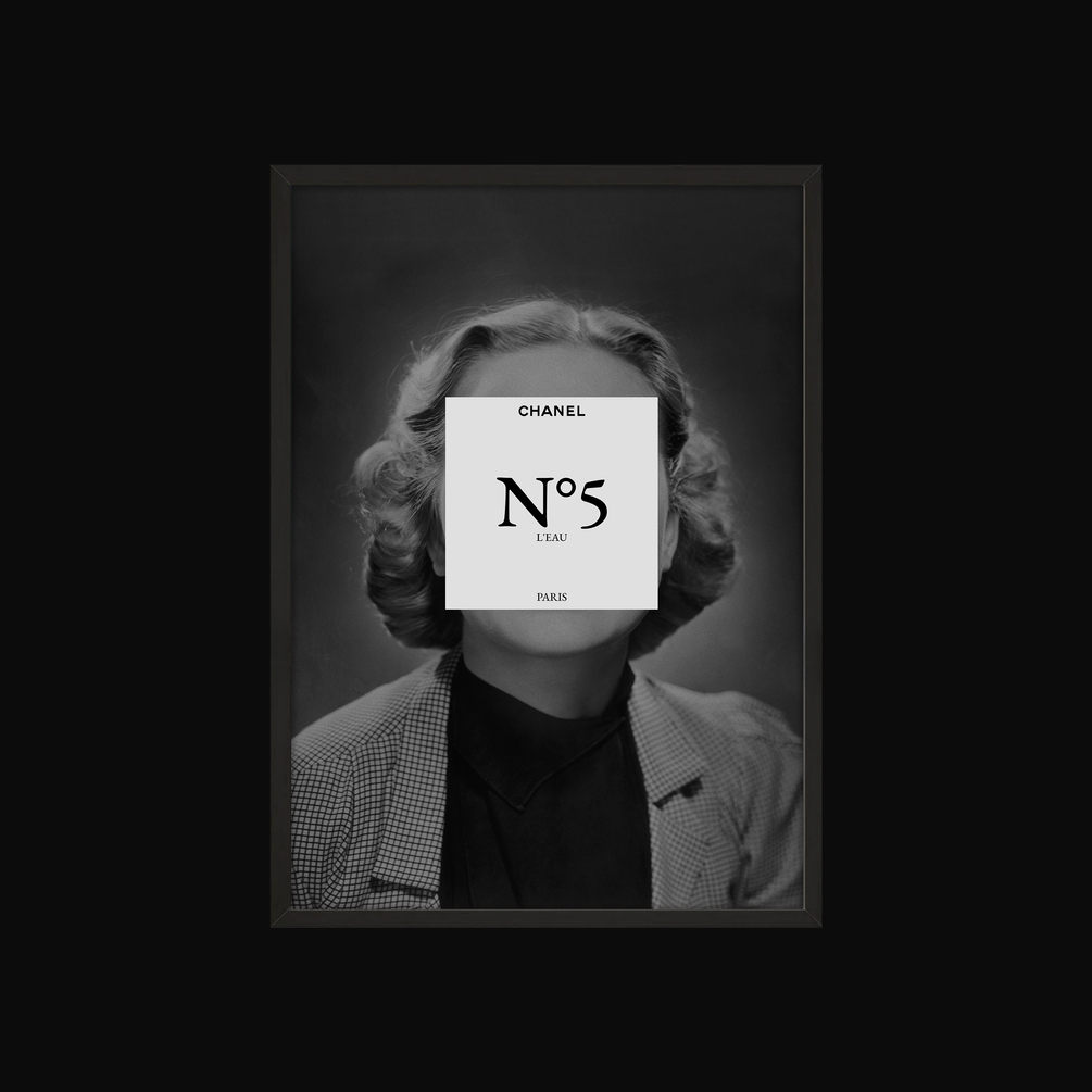 The minimalist poster design creates a powerful contrast between the classic portrait photography and the famous Chanel label showing women's love for the brand.